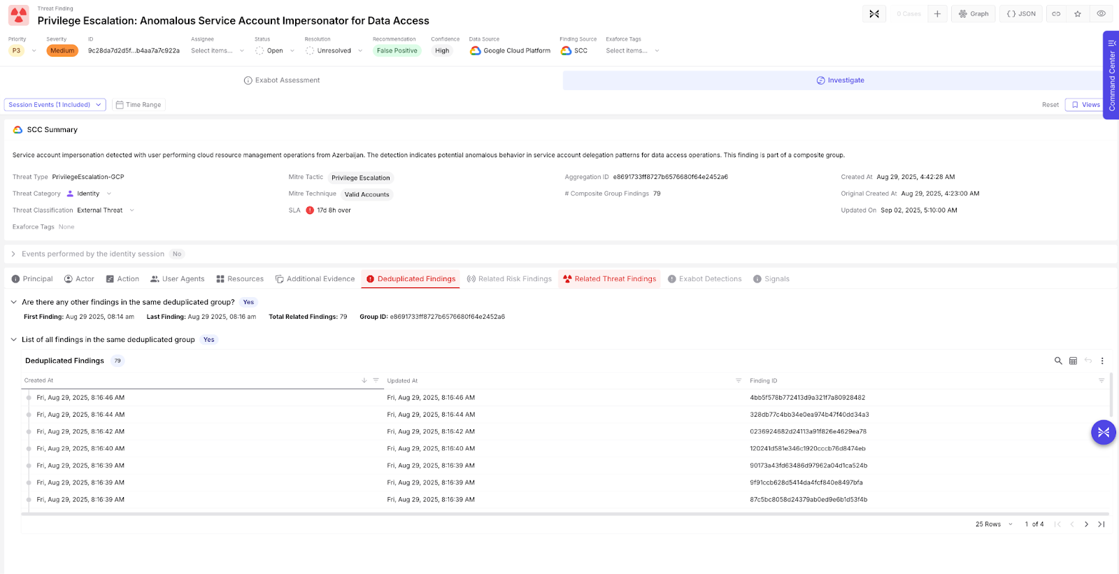 API call was made 79 times by a user who often performs this action. In SCC, this action is configured to automatically trigger an alert. As such, the tool simply generated 79 alerts. For the analyst, investigating these duplicated alerts is rather cumbersome. The Exaforce approach instead provides one alert and calls out the 79 duplicates. The deduplication is explained in the AI generated summary, and the individual duplicates are present in the details if needed.