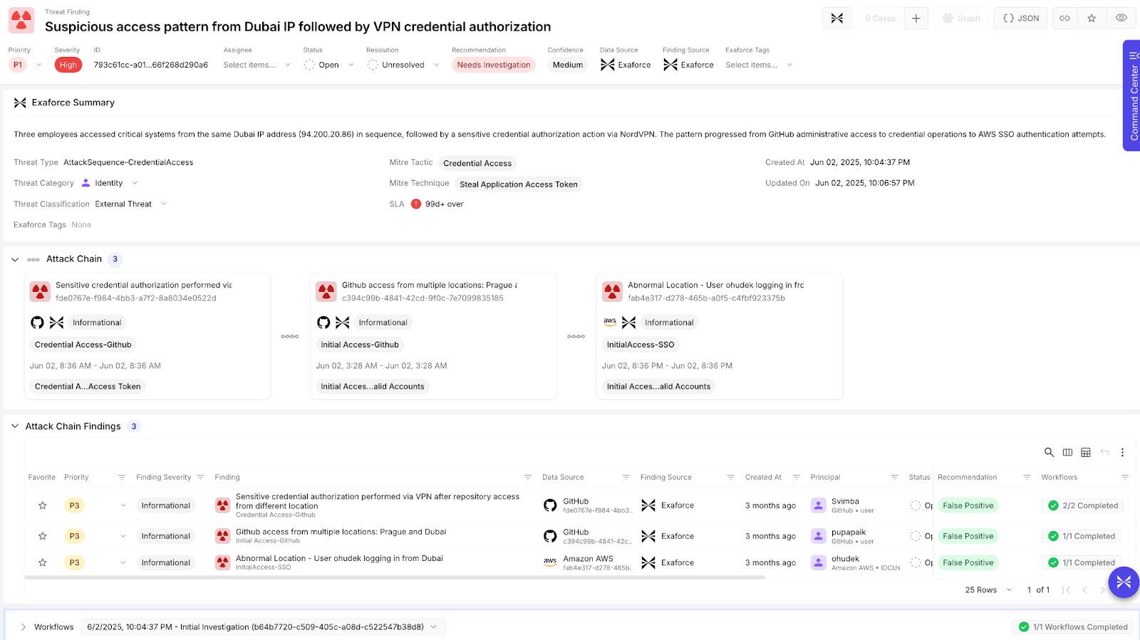 By automatically recognizing these varied relationships, Exaforce surfaces higher-order attack narratives rather than isolated alerts.