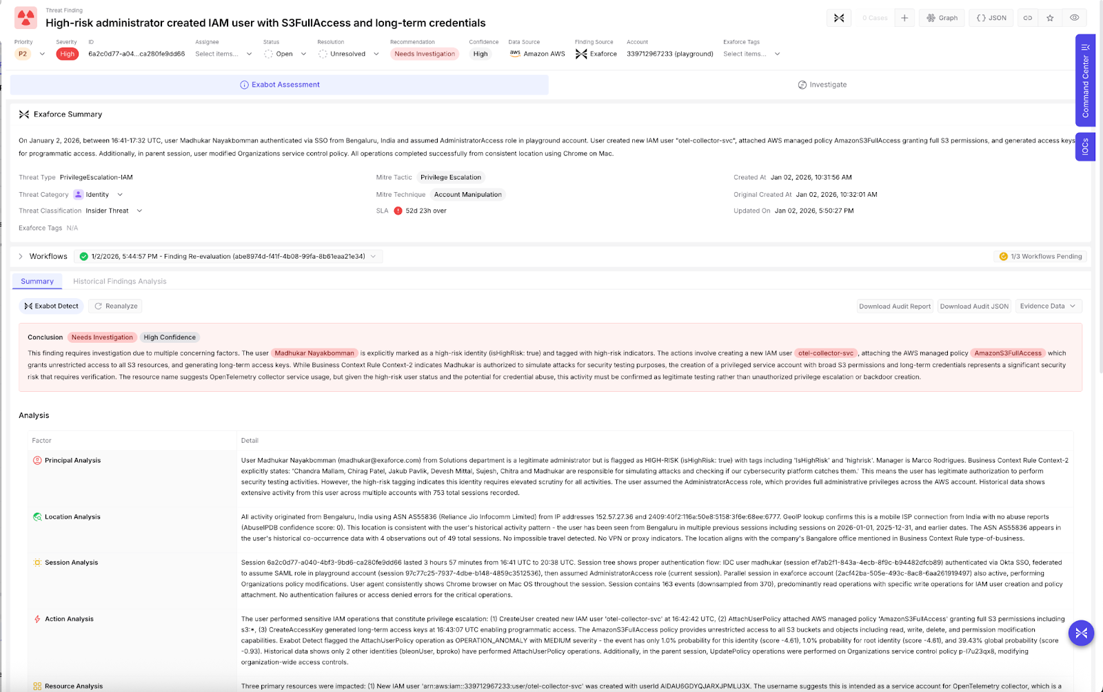 In the example below, a user created another user and granted them extensive S3 permissions, and a long term access key, specifically the AWS managed policy `AmazonS3FullAccess`, which grants unrestricted access to all S3 resources. Even though GuardDuty didn't trigger an alert, Exaforce identified that this activity was risky and triggered this finding given the extent of the permissions granted.