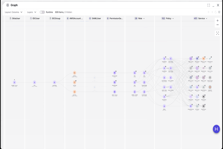 The end result of this evaluation may look like the graph below. This graph shows the process by which this user is able to achieve access to each of these services. The Runtime toggle easily shows which roles and services are actually used by the identity.