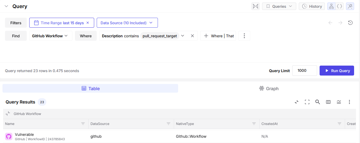 To identify vulnerable workflows, we need to search GitHub for pull_request_target usage in the .github/workflows directory for a specific organization. Exaforce collects this information and provides a list of GitHub workflows that contain the pull_request_target field and may therefore be vulnerable.