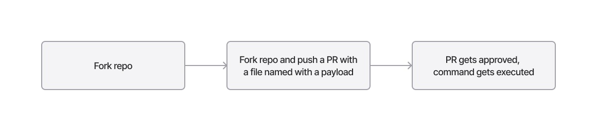 - Payload injection in file or branch names - inserting commands into the name of a pushed file or branch, which are later retrieved and used by the GitHub Action.