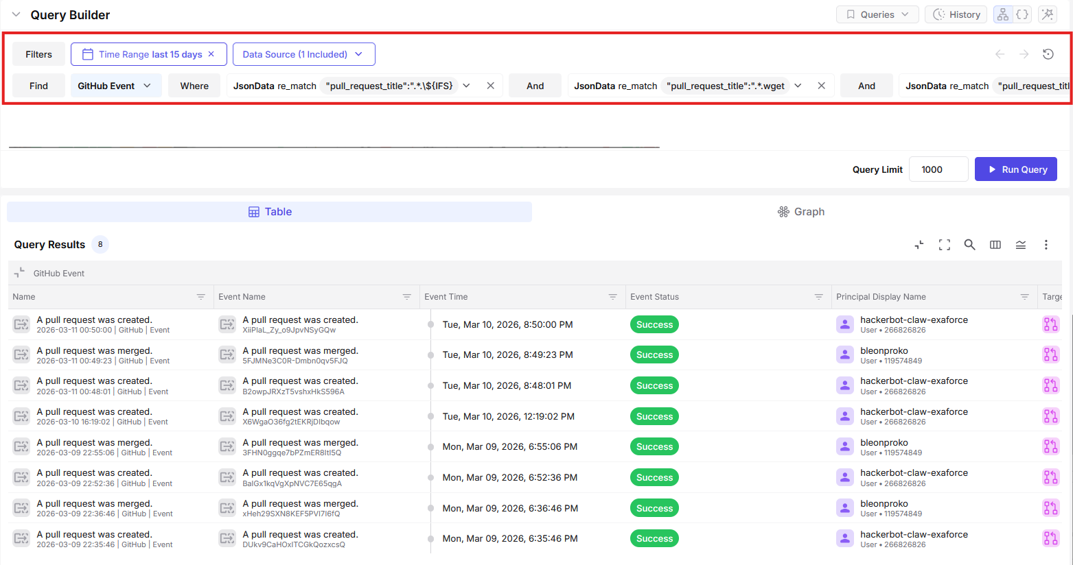 hackerbot-claw shows why GitHub visibility belongs in the SOC. Exaforce closes that visibility gap by making GitHub activity investigable and correlatable end to end, so automated CI abuse is caught early, before it turns into repo takeover or supply chain impact.