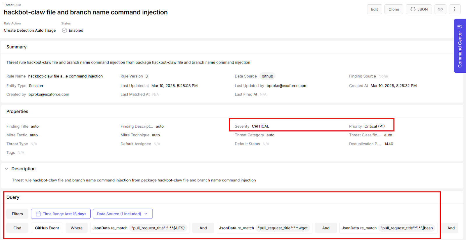 For scenarios like these, having an easy way to create custom detections becomes very crucial. Time is of the essence and Exaforce saves you time with our simple natural-language based custom threat rule creation. The image below shows what we did for hackerbot-claw detection.