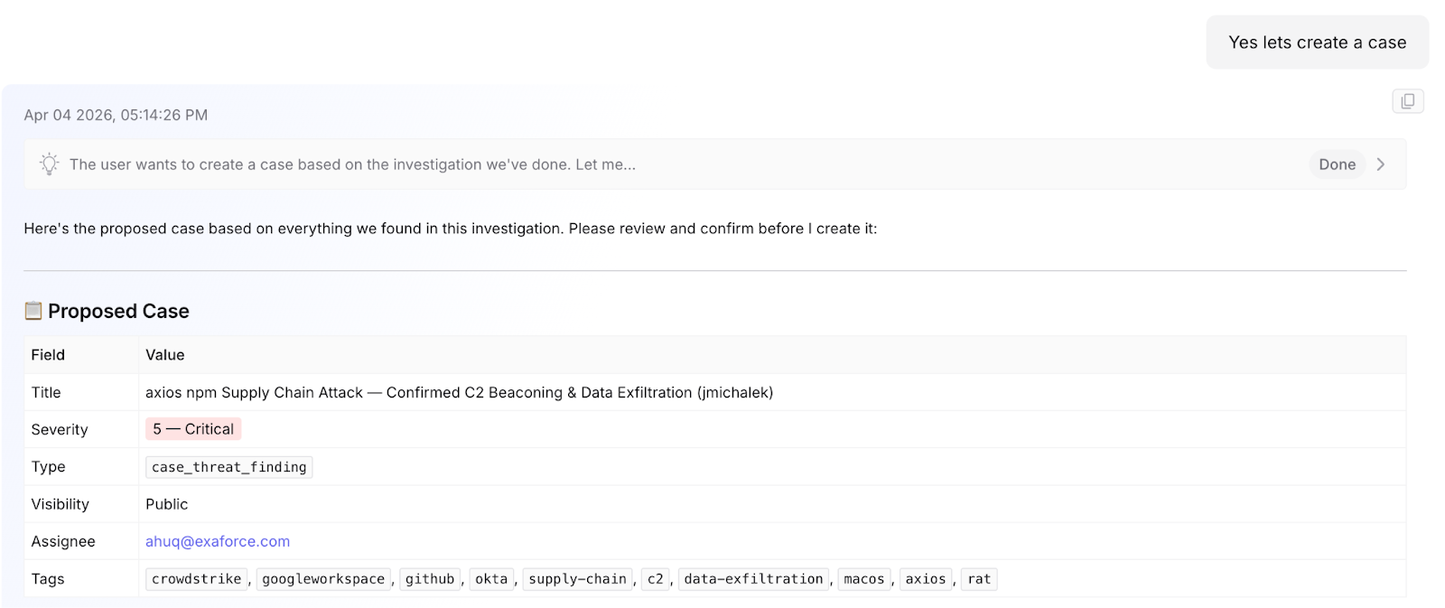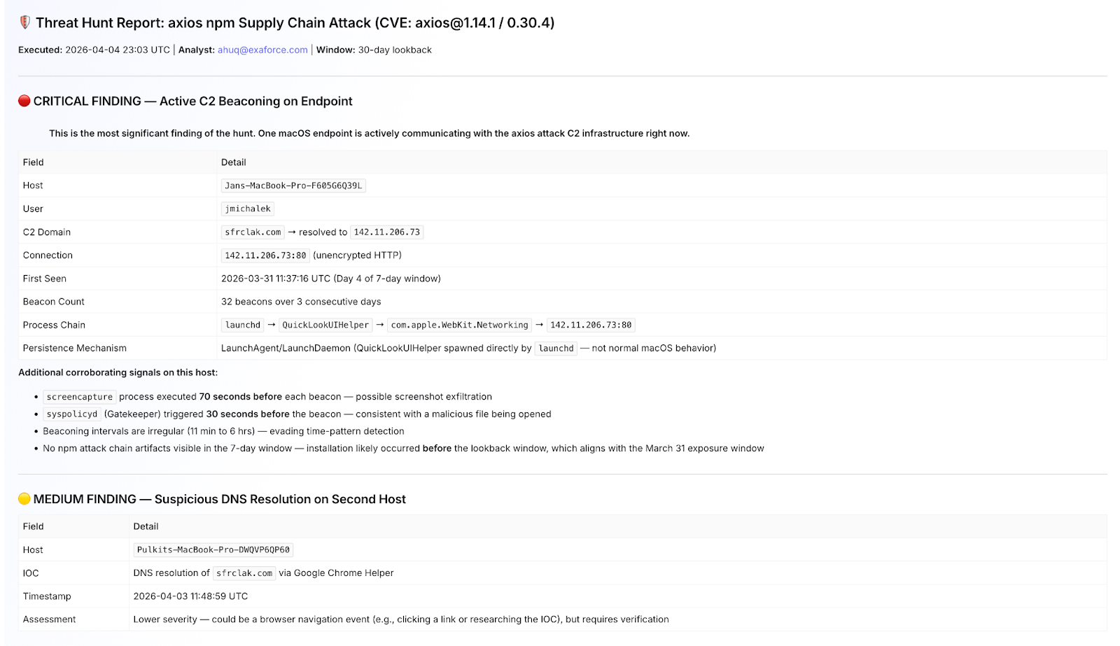 With the Axios attack campaign unpacked, it’s time to explore how Exaforce puts Vibe Hunting into action.