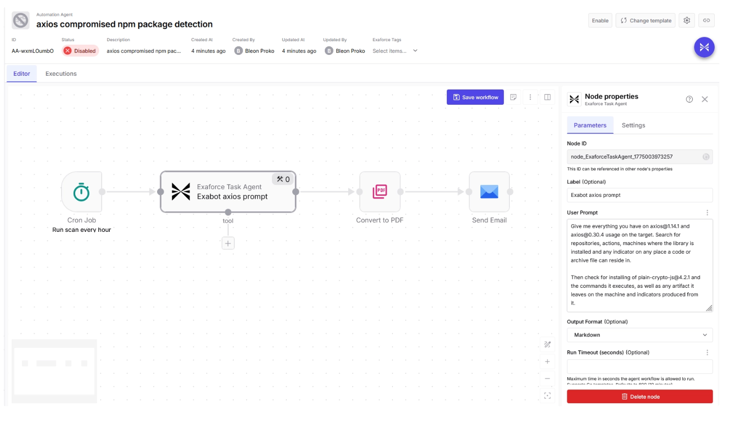 The automation agent shown above will trigger every hour and run the prompt we came up with earlier via a special node in the workflow called a Task Agent, instructing it to search for potential IOCs in the environment and send a PDF report of the findings to the security team via email. This essentially replicates the role of a SOC engineer performing periodic checks for potential breach indicators.