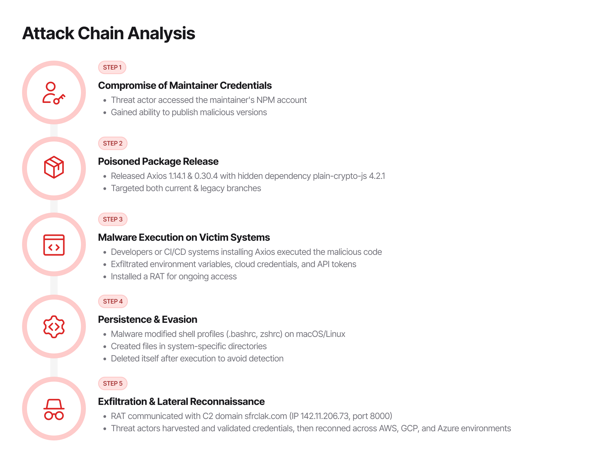 The attackers gained access to the Axios maintainer’s publishing credentials and released poisoned versions 1.14.1 and 0.30.4, containing a hidden malicious dependency, plain-crypto-js. This malware stole sensitive credentials (cloud keys, API tokens, database passwords) and installed a Remote Access Trojan (RAT) for persistent access.