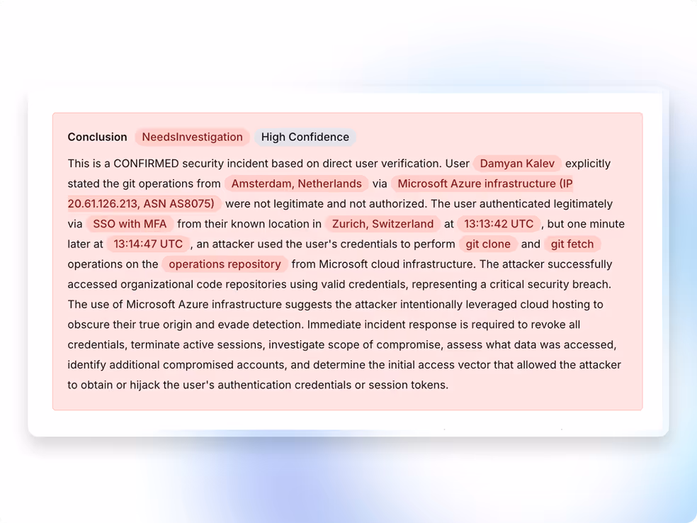 Every Exabot alert comes with clear reasoning. You see the evidence, the context, and the MITRE technique behind each detection, so your analysts and auditors always know why something was flagged.
